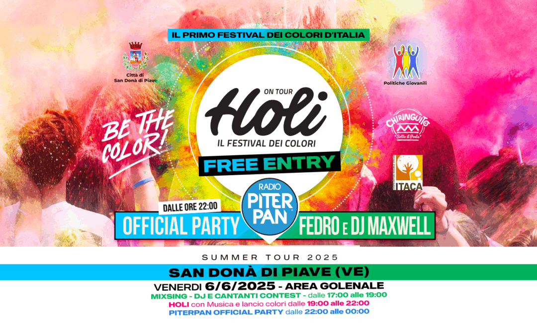 HOLI a San Donà di Piave (VE)Città di San Donà di Piave – Politiche Giovanili, Cooperativa Itaca con la collaborazione di Chiringuito Sotto il Ponte presentano: COLOR JAM – dove il colore incontra il suono HOLI, IL FESTIVAL DEI COLORI + PITERPAN OFFICIAL...